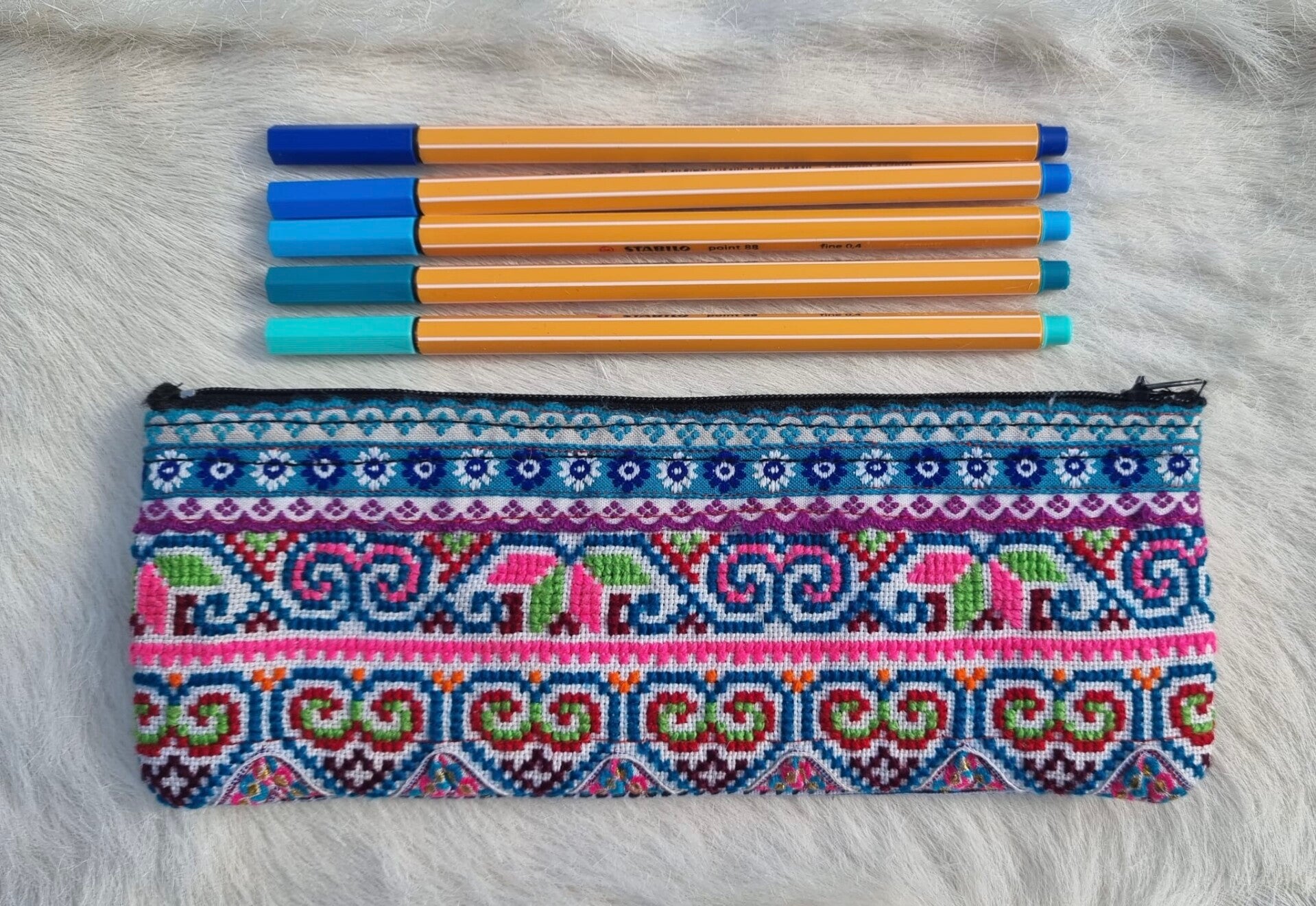 Super vrolijk etui voor in je (school)tas of op je bureau. De voorkant is geborduurd en de achterkant heeft een mooi stofje.