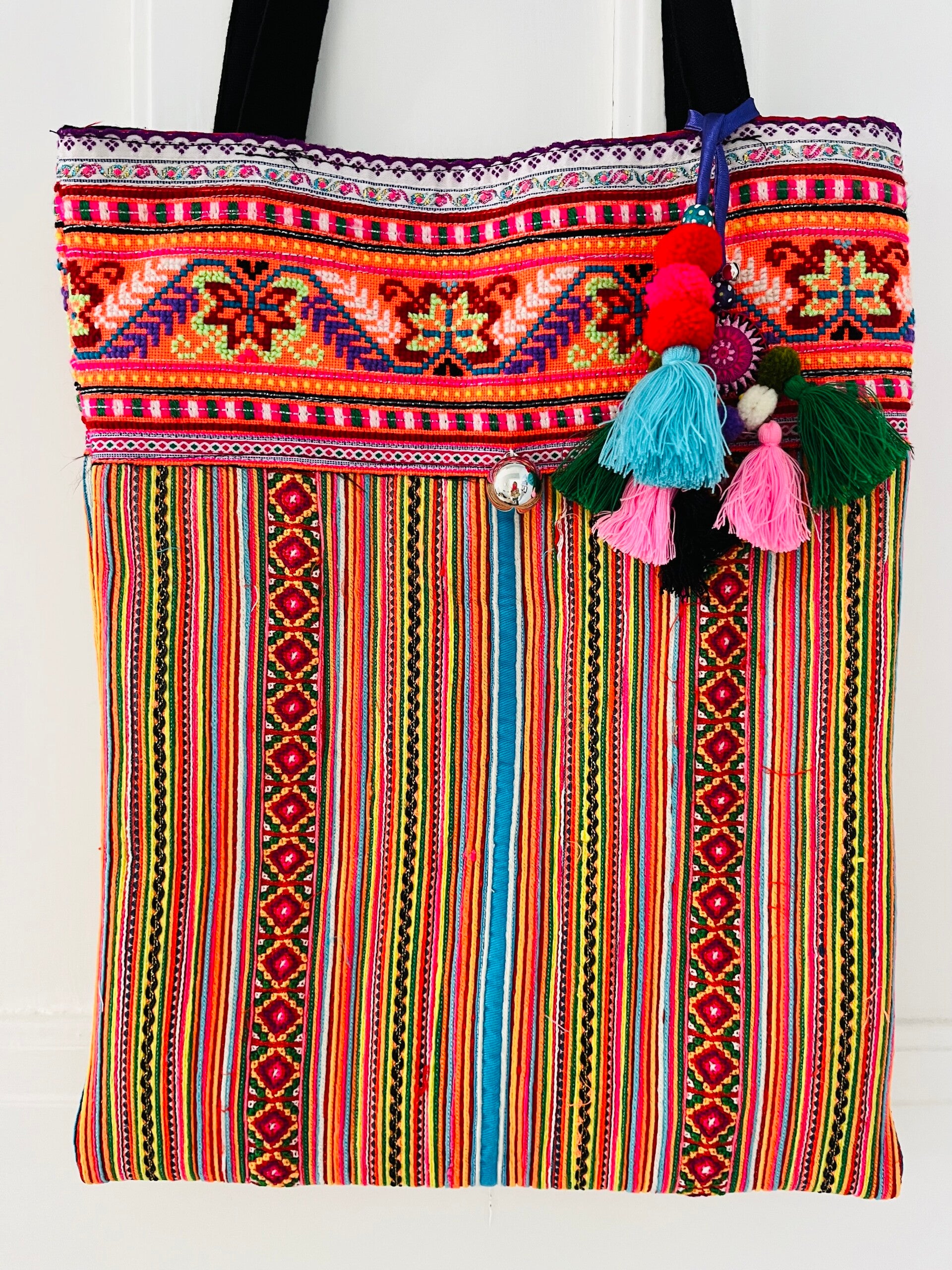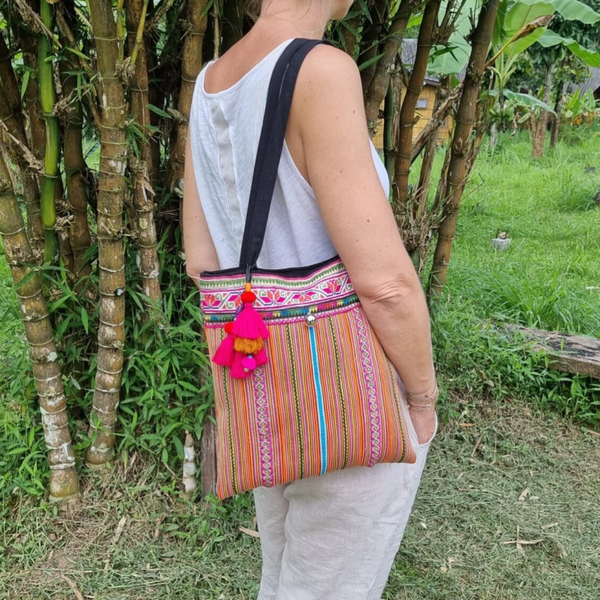 Te gekke tas met prachtig patroon en geborduurde rand. De tas is gemaakt van zeer stevige stof en daarom ook ideaal voor je MacBook of een klein fotmaat laptop. Voorzien van een rits en binnenvakje én een hanger die de tas helemaal afmaakt.