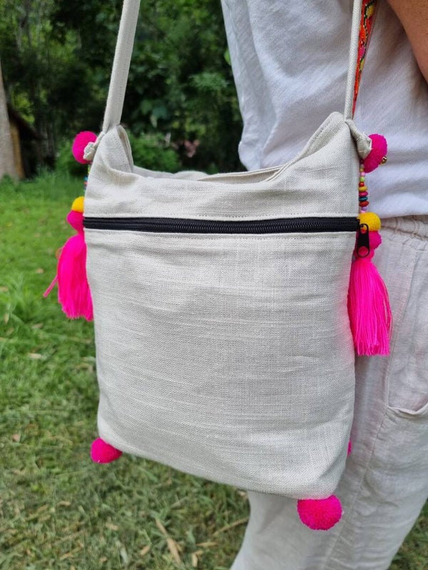 Prachtige medium tas in zandkleur en een veelkleurige geborduurde print.