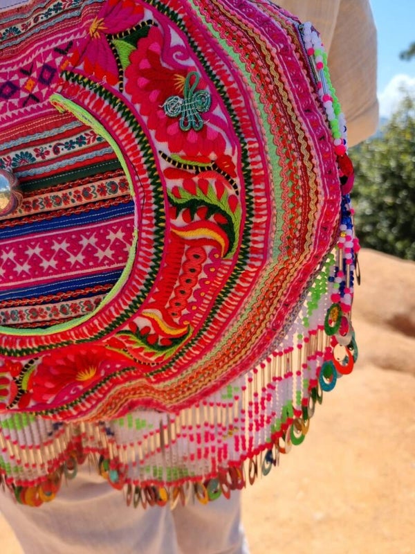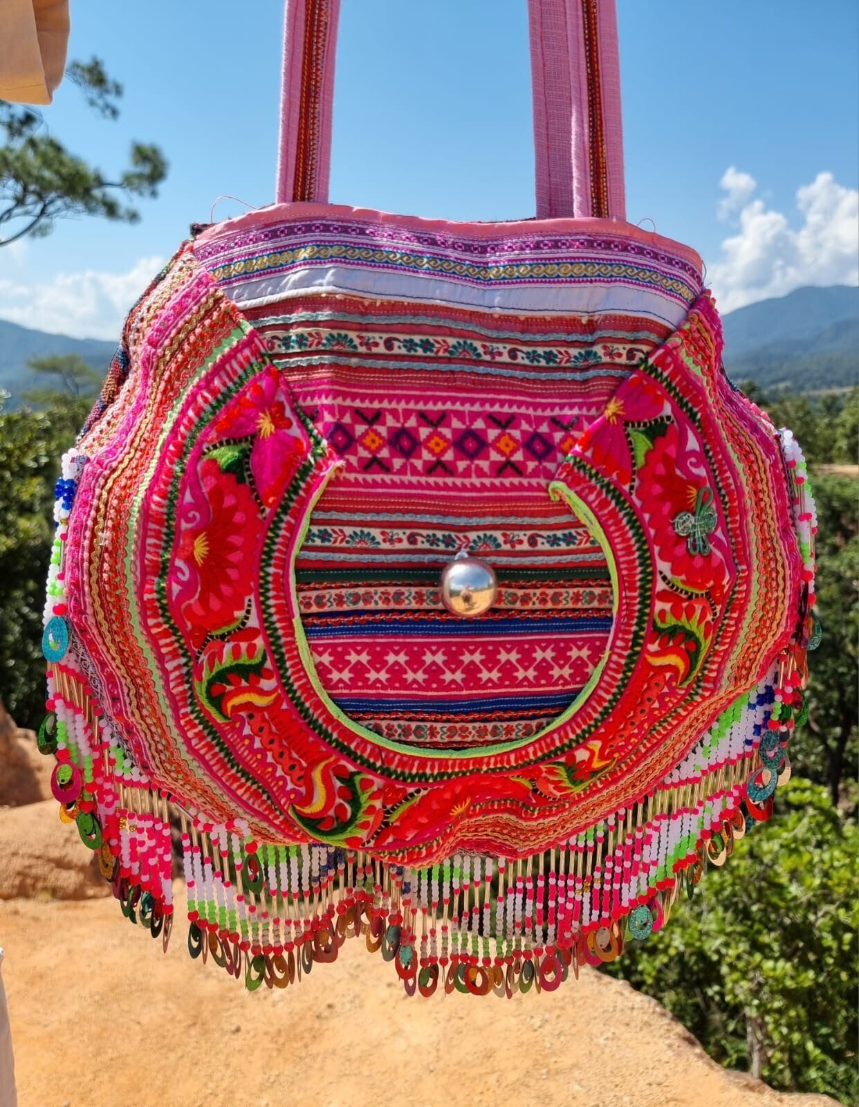 Deze tas is zoooo mooi. Eigenlijk vinden wij alles mooi aan deze unieke tas; kijk maar eens naar het ronde model, de gevarieerde kralenreeksen, en de handgeborduurde stof in combinatie met de geweven kleurrijke katoenen stof aan achterkant van deze tas.