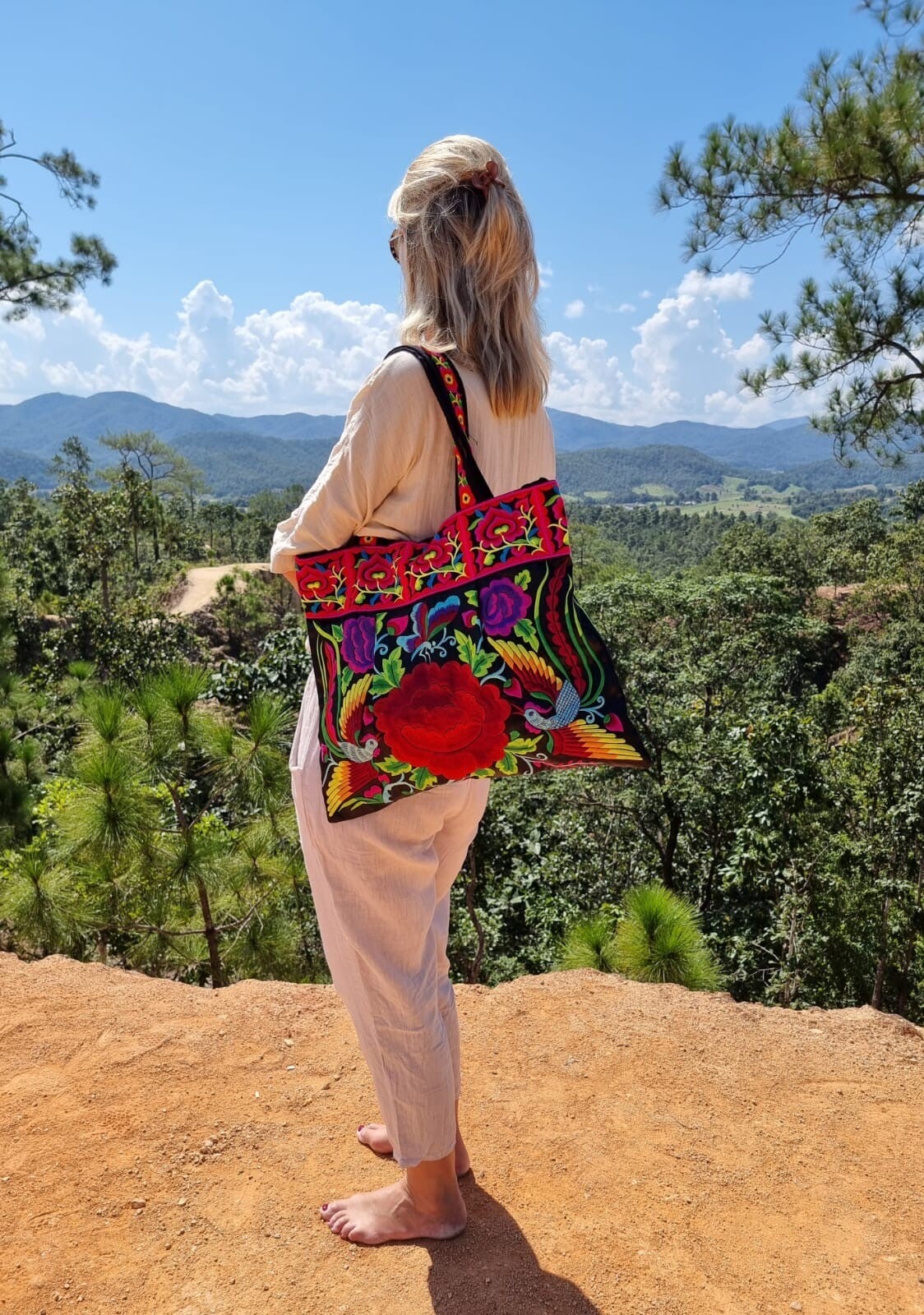 De stof van deze tas is machinaal geborduurd, dat maakt de tas stevig en sterk. Door de donkere achtergrond komen de geborduurde kleuren goed tot zijn recht. Deze tas is, door de zachte glans, een echte eyecatcher🩷!