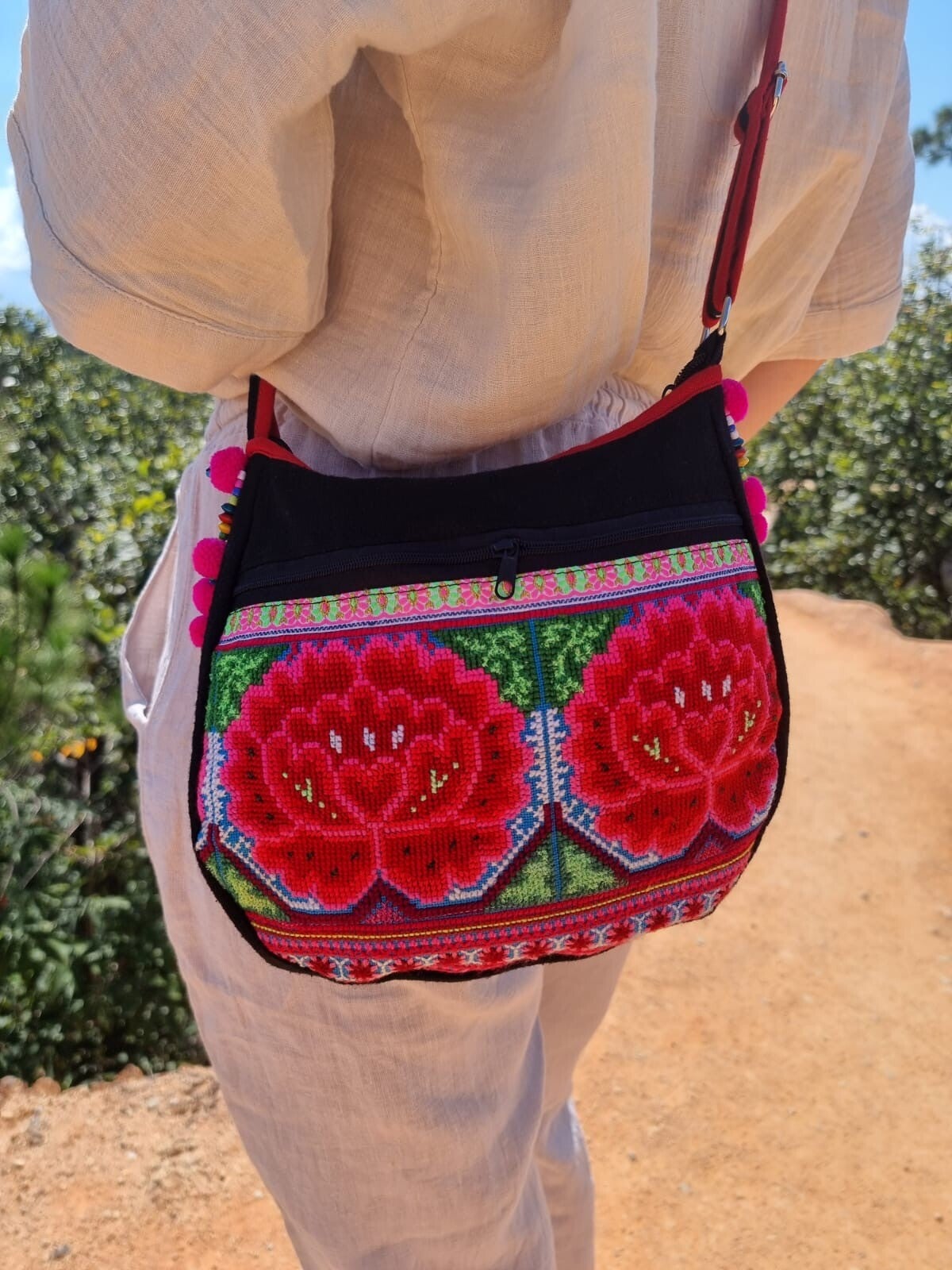 Tasje met handgeborduurde bloemen 🩷 in felle kleuren en zwarte ondergrond. Ideaal formaat voor je spullen zoals telefoon, portemonnee, sleutels. De tas heeft een extra vakje met rits, een stevige schouderband die je kunt verstellen en ook crossover kunt dragen.