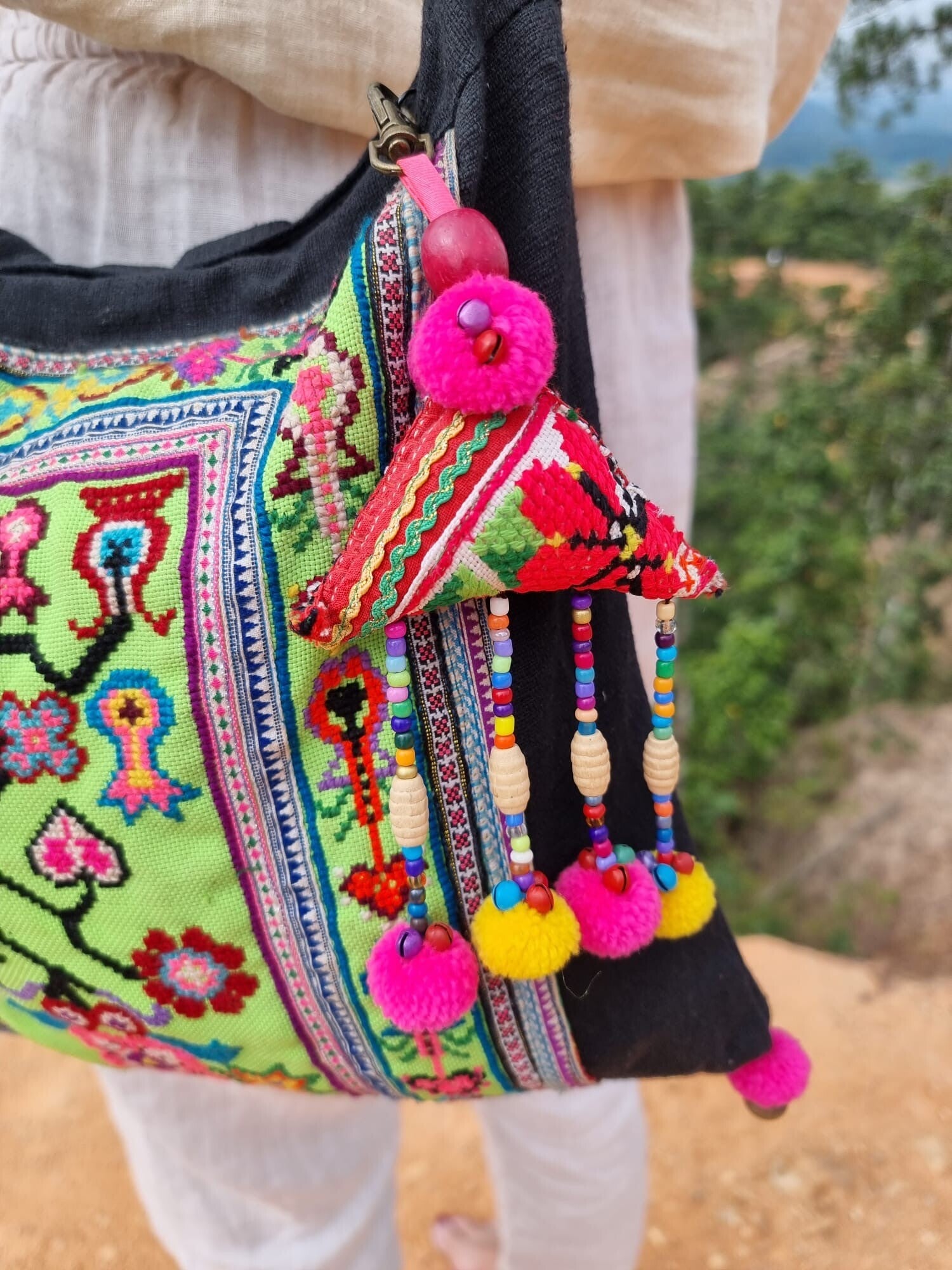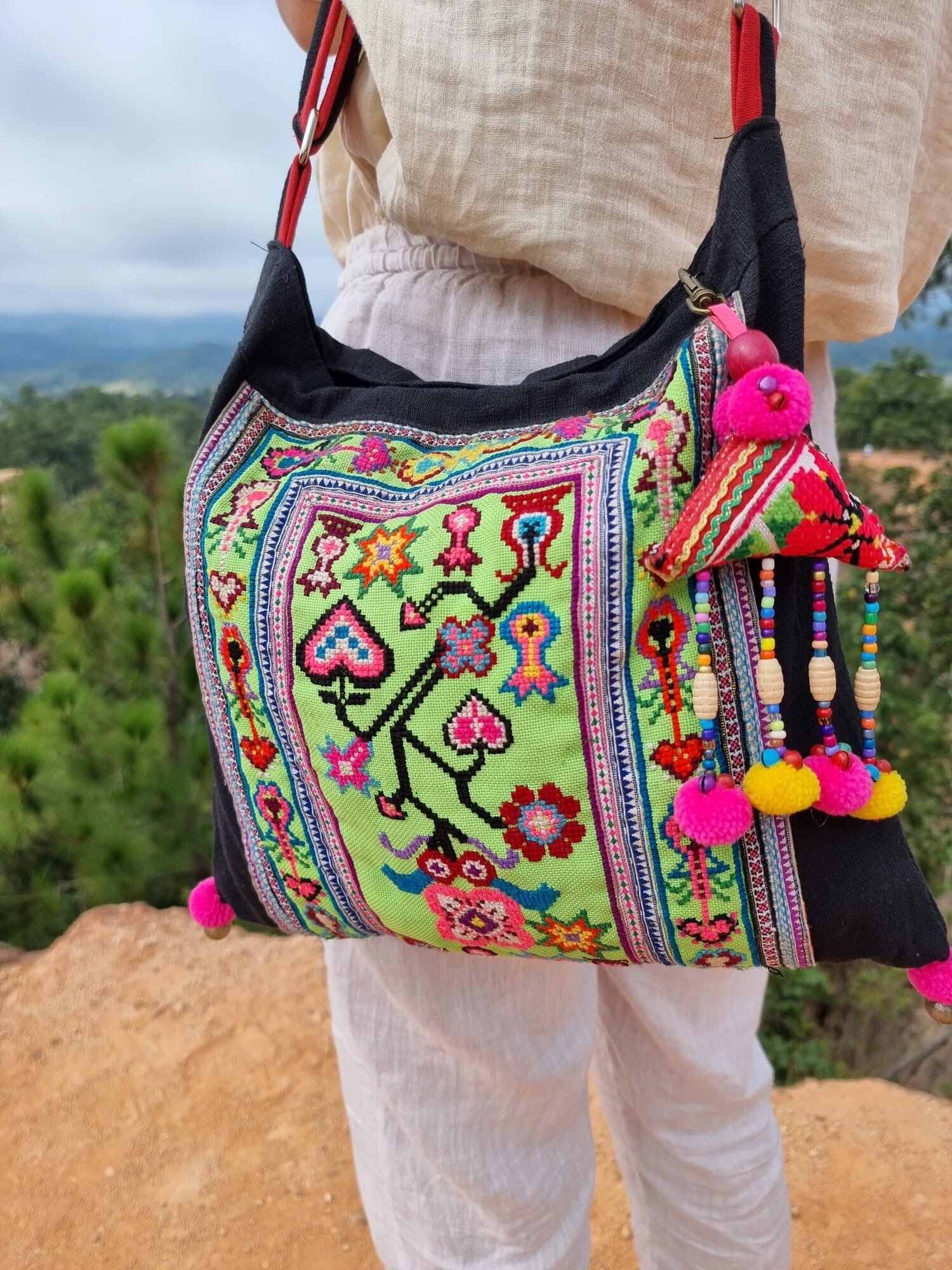 De mooie tas heeft een geborduurde print van voren en van achter. De tas heeft een rits en een lange schouderband die je kunt verstellen.