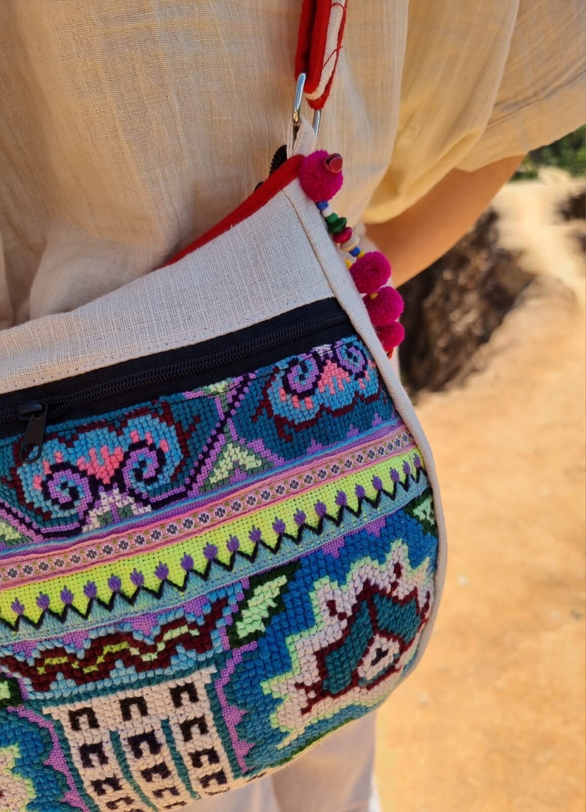 Tasje met handgeborduurde bloemen 💙 in mooie blauw en paars tinten en crème witte ondergrond. Ideaal formaat voor je spullen zoals telefoon, portemonnee, sleutels. De tas heeft een extra vakje met rits, een stevige schouderband die je kunt verstellen en ook crossover kunt dragen.