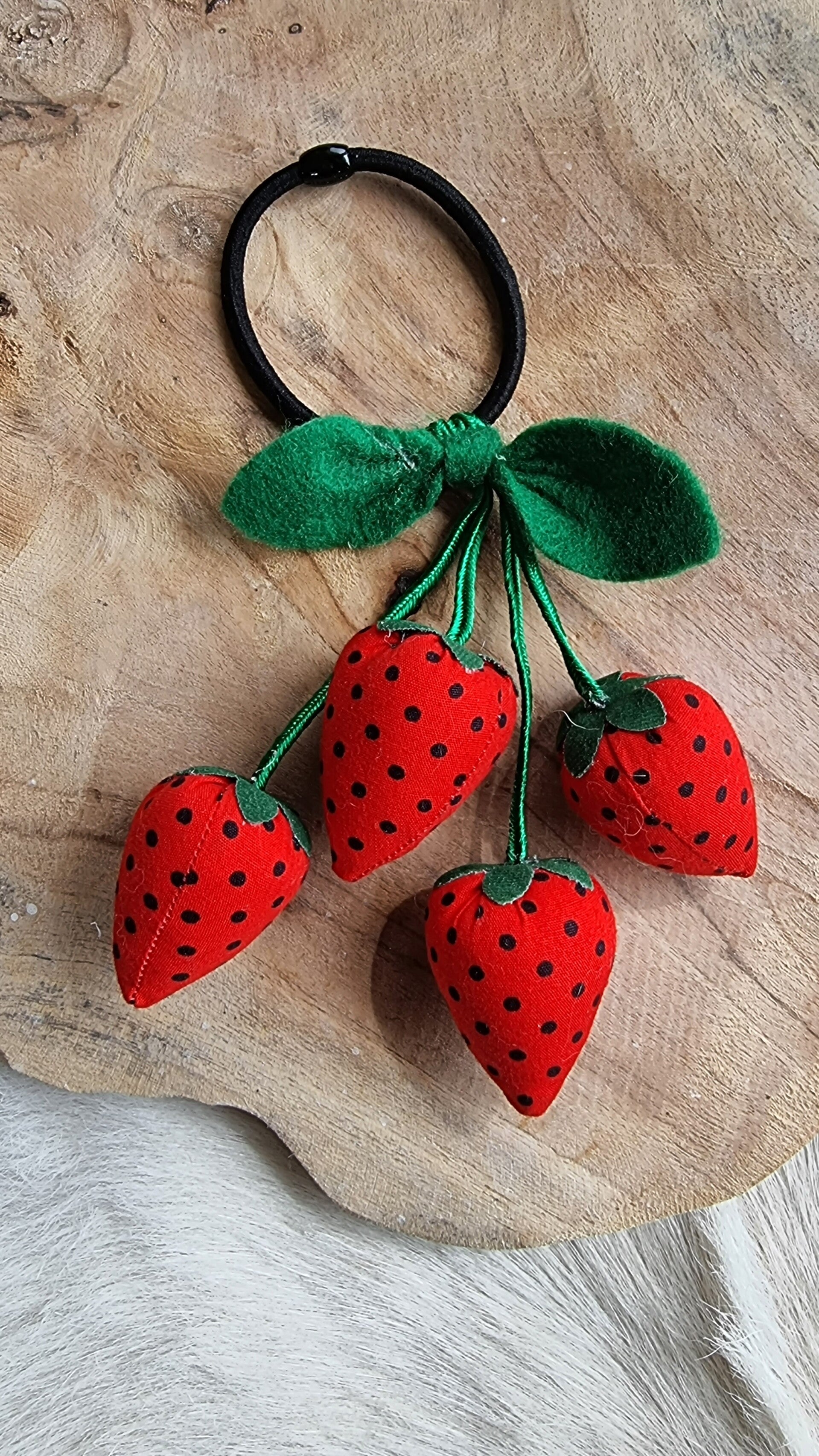 Deze haarhanger mét elastiek kun je op allerlei manieren dragen. Bij ons modelletje hebben we de bovenste haren samengepakt en het elastiekje om een soort knotje geknoopt. Je kunt er natuurlijk ook voor kiezen om een mooie staart te maken. Deze hanger met aardbeitjes en pompommetjes maken je kapsel helemaal af. Een totaalplaatje om vrolijk van te worden.