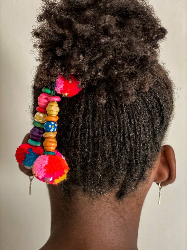 Deze haarhanger mét elastiek kun je op allerlei manieren dragen. Bij ons modelletje hebben we de bovenste haren samengepakt en het elastiekje om een soort knotje geknoopt. Je kunt er natuurlijk ook voor kiezen om een mooie staart te maken. Deze hanger met aardbeitjes en pompommetjes maken je kapsel helemaal af. Een totaalplaatje om vrolijk van te worden.