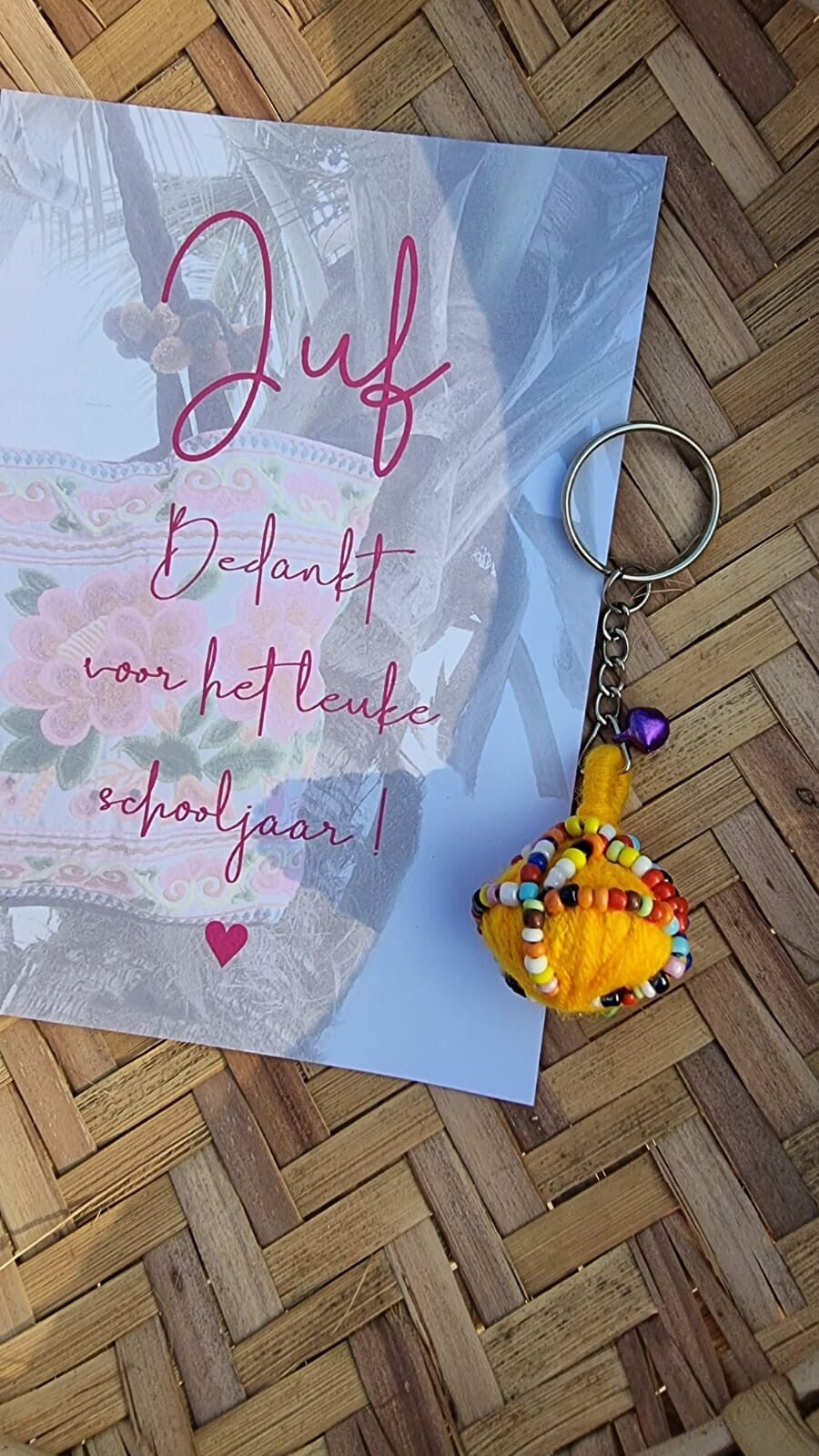 Het einde van het schooljaar is in zicht; bedank jouw lieve juf met een sleutelhanger én ontvang gratis een bijpassende kaart. Op de achterkant kun je een persoonlijke boodschap schrijven. En we pakken het cadeautje natuurlijk voor je in.