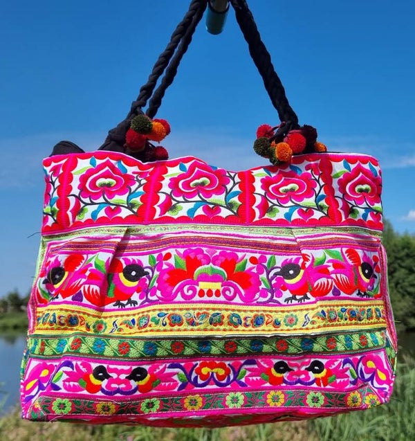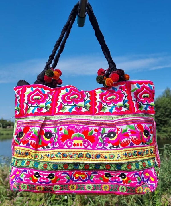 Een eyecatcher, deze gebloemde roze tas met vogeltjes. Lekker groot dus ook goed te gebruiken als strandtas.